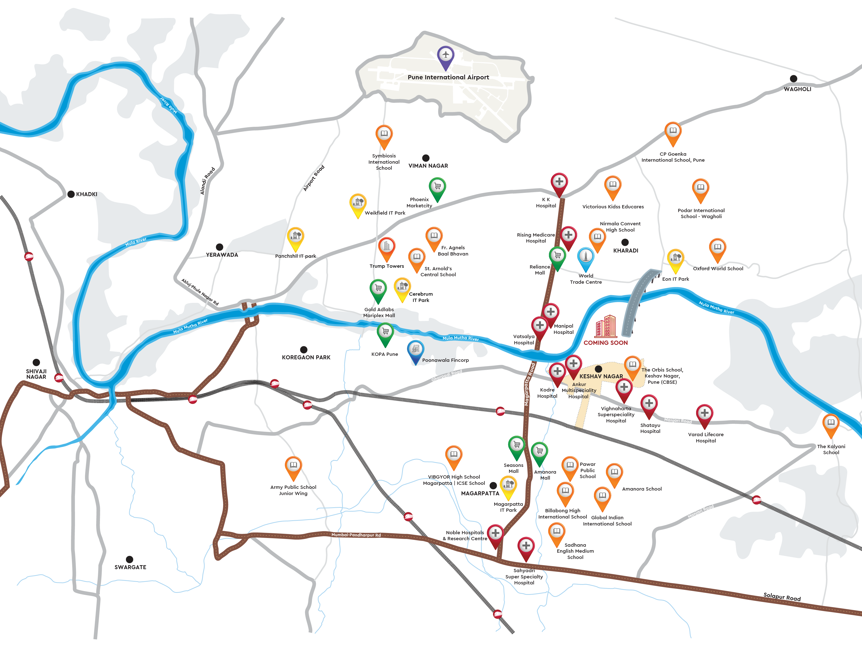 Let your mornings begin by the river, with life’s daily essentials just minutes away. Esteemed schools like The Bishops and HDFC are close by, with Zensar IT Park and Reliance Mart equally within reach. Healthcare and everyday essentials flow seamlessly around you — so ease becomes part of your everyday life.